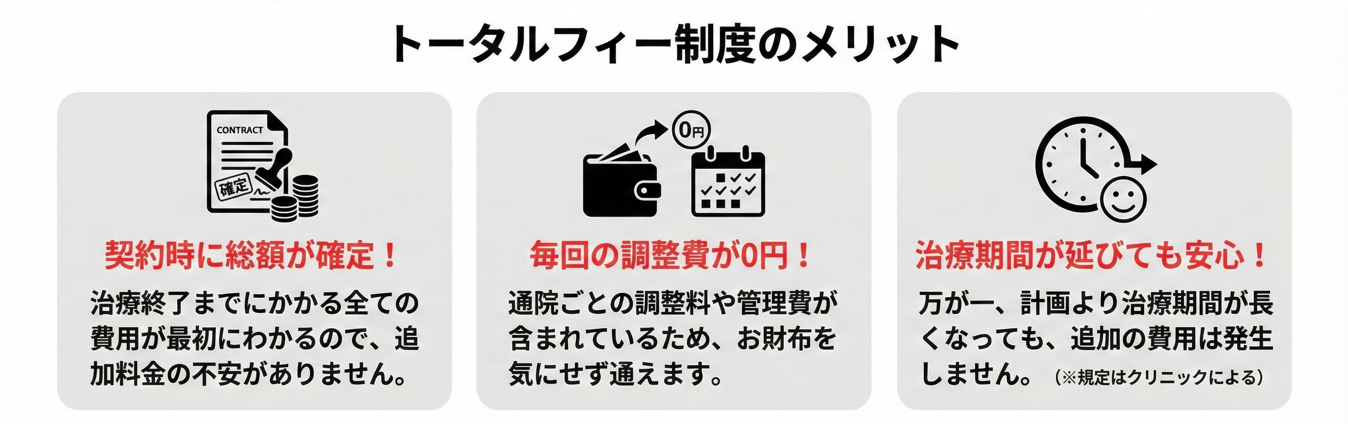 矯正歯科の中には、治療費のほか調整費などの追加費用がかかるところもあります。矯正中の思わぬ出費を避けたい方は、トータルフィー制の矯正歯科がおすすめです。