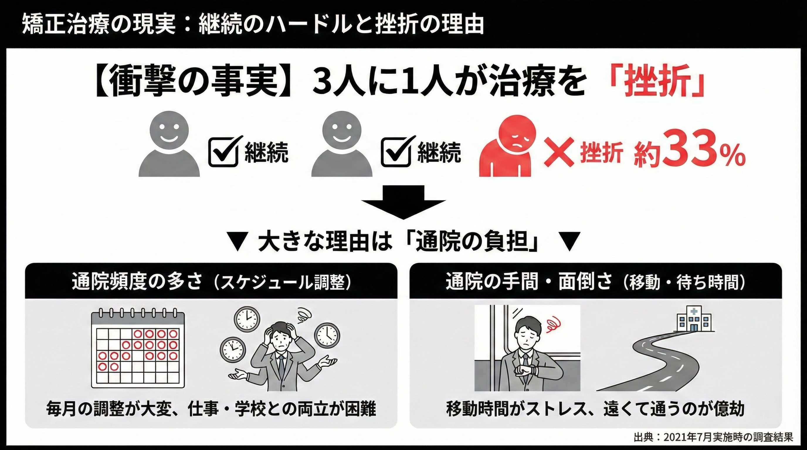 実は、矯正治療を始めた3人に1人が挫折を経験。理由の1つには、通院の多さや面倒な点があげられています。(2021年7月実施時の調査結果)