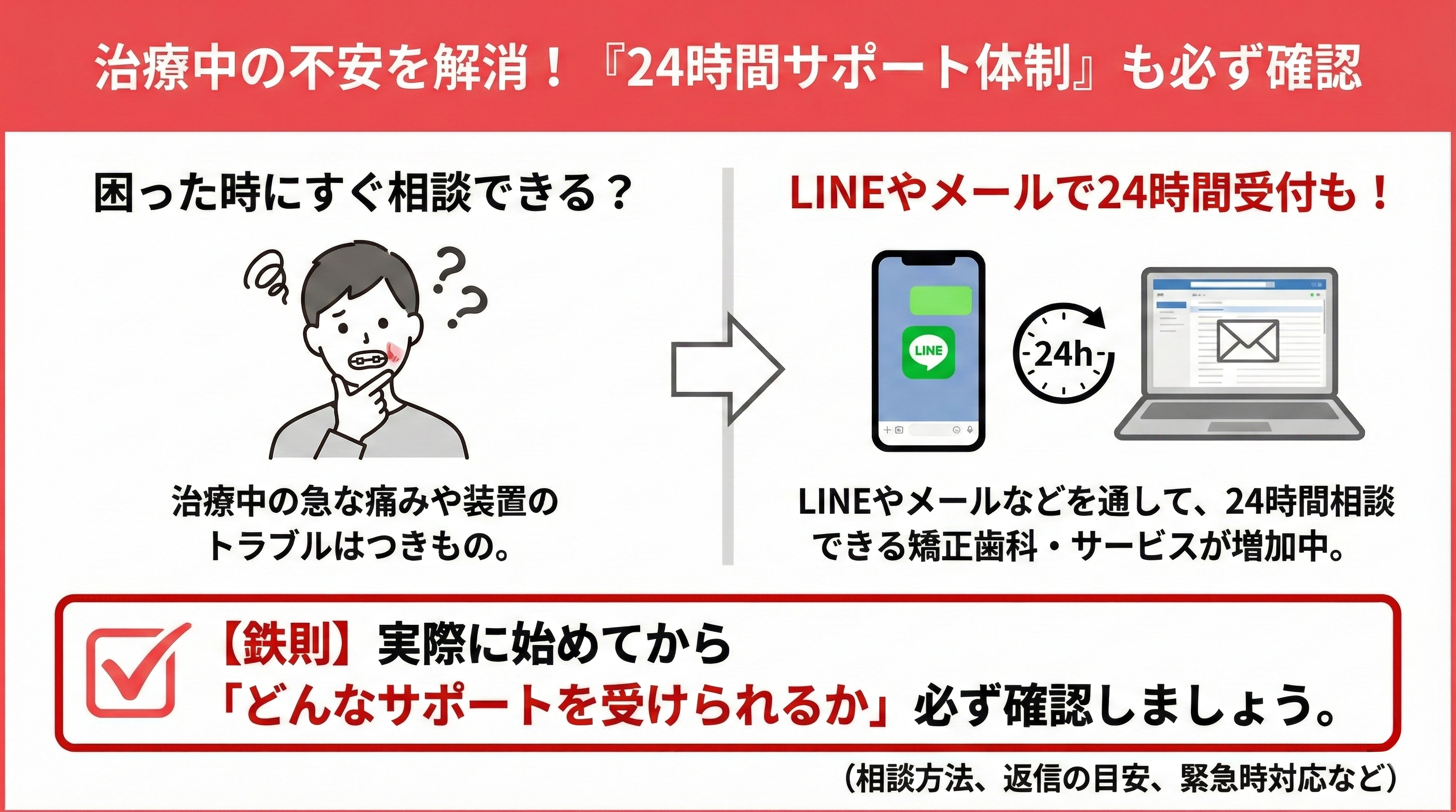 また、LINEやメールなどを通して、24時間相談できる矯正歯科・サービスもあります。実際に始めてからどんなサポートを受けられるのが、必ず確認しましょう。