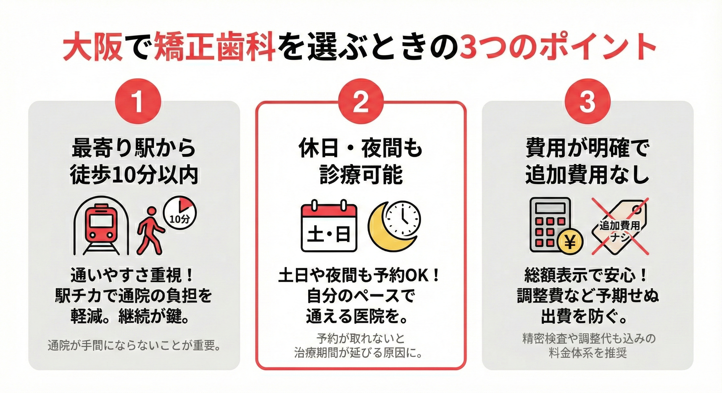 大阪で矯正歯科を探す際は、3つのポイントを押さえましょう。