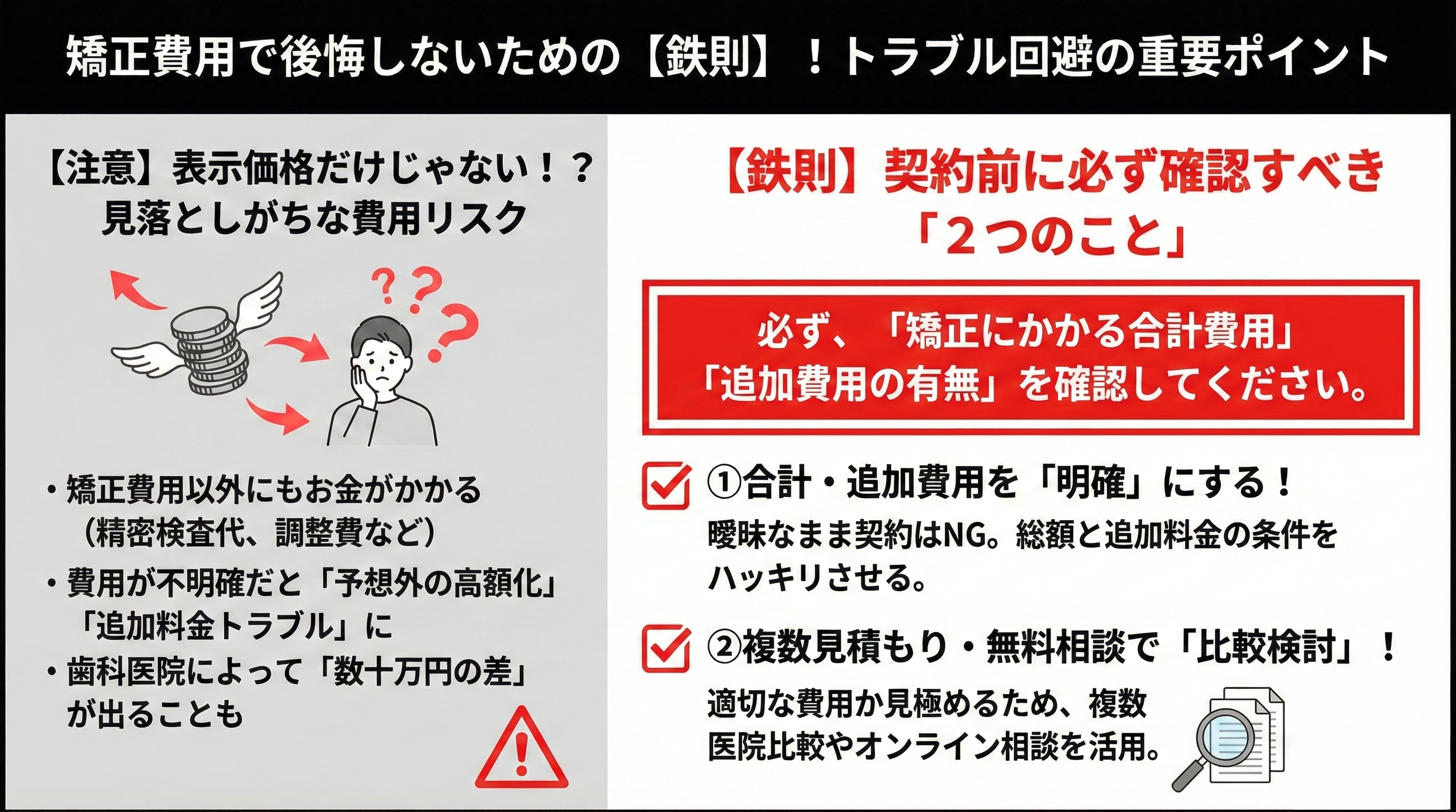 必ず、「矯正にかかる合計費用」「追加費用の有無」を確認してください。