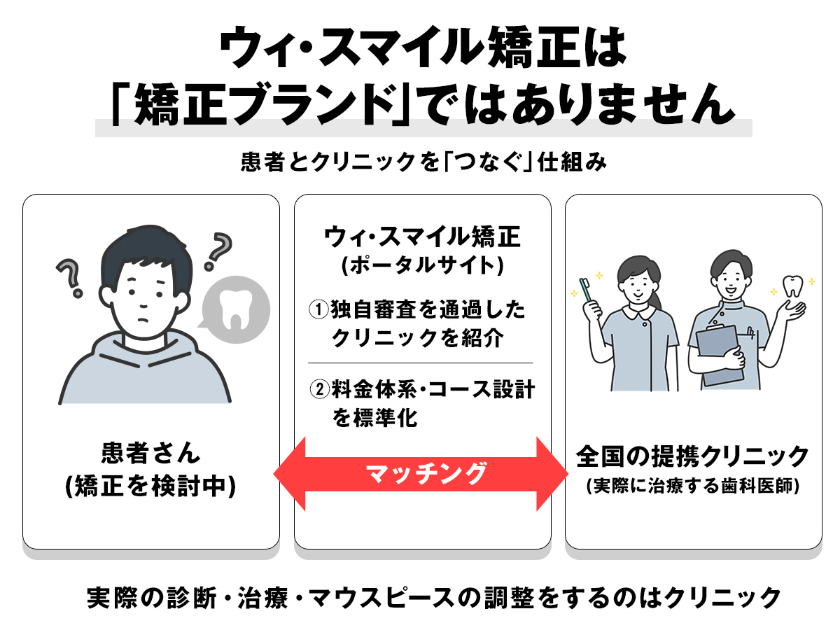 つまり、ウィ・スマイルは、「矯正を受けたい患者さん」と「全国の提携クリニック」をつなぐマッチングプラットフォームです。