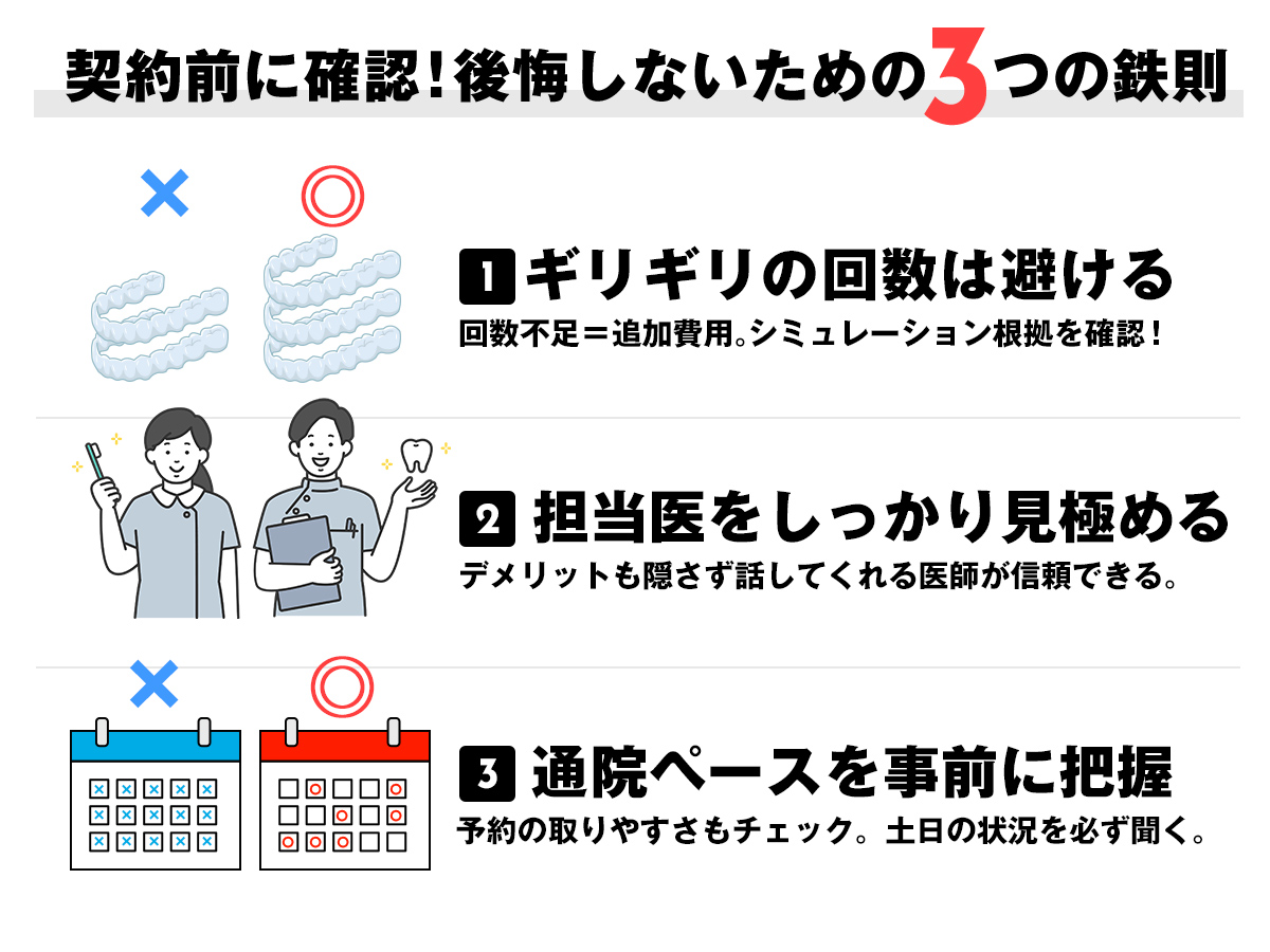 マウスピース矯正は、自分の歯並びに合ったサービスを選ぶかがとても大切です。1院・1サービスだけで即決せず、必ず複数を比較検討しましょう。