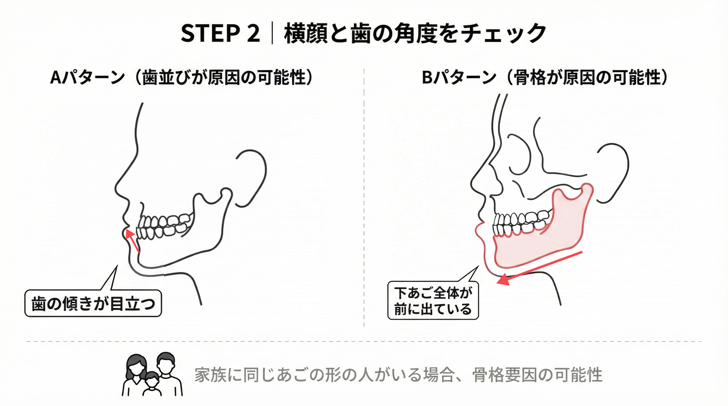 - 家族や親戚に同じようなあごの形の人がいる(遺伝的要因が強い)。