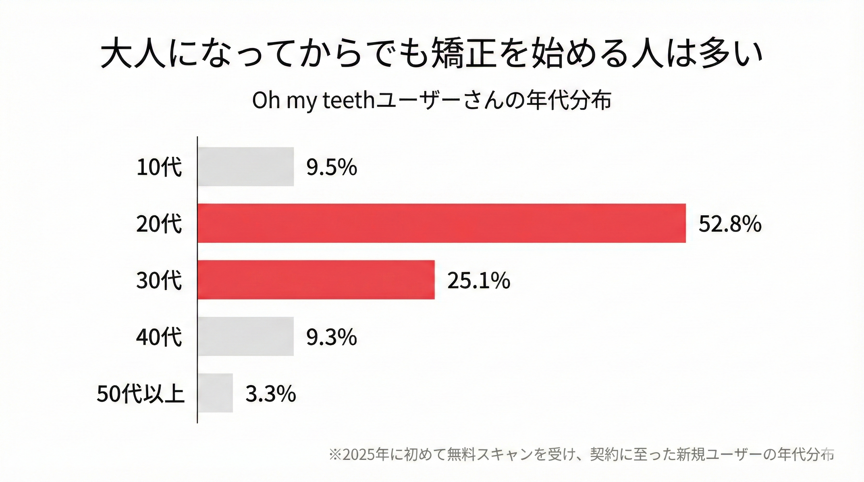 はい、健康な歯と骨があれば、年齢に関わらず矯正を検討できます。実際、マウスピース矯正 Oh my teethのユーザーさんは20~40代がメインですが、50代以上の方にもご利用いただいています。
