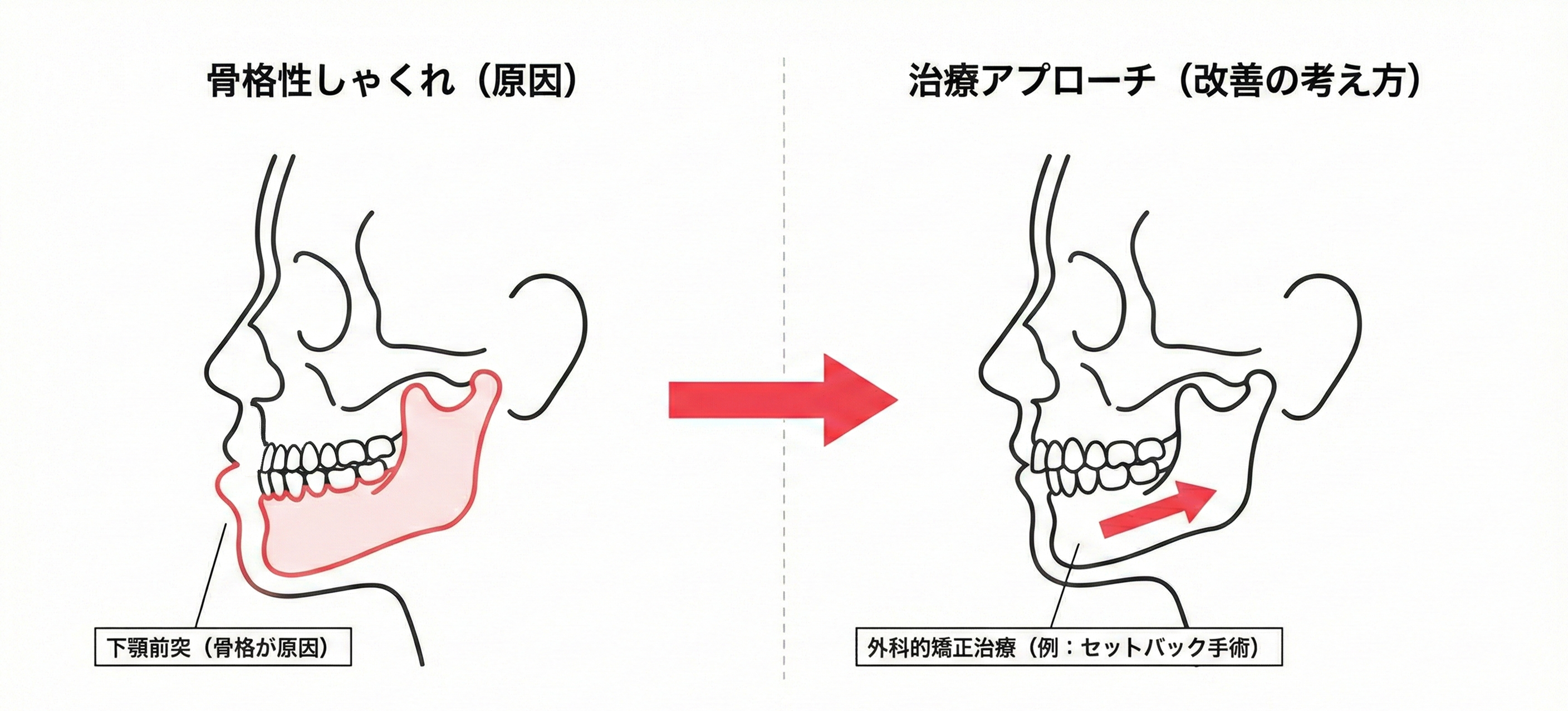 骨格に原因があるしゃくれ(下顎前突)の場合は、あごの骨そのものを整える外科的矯正が必要になることがあります。