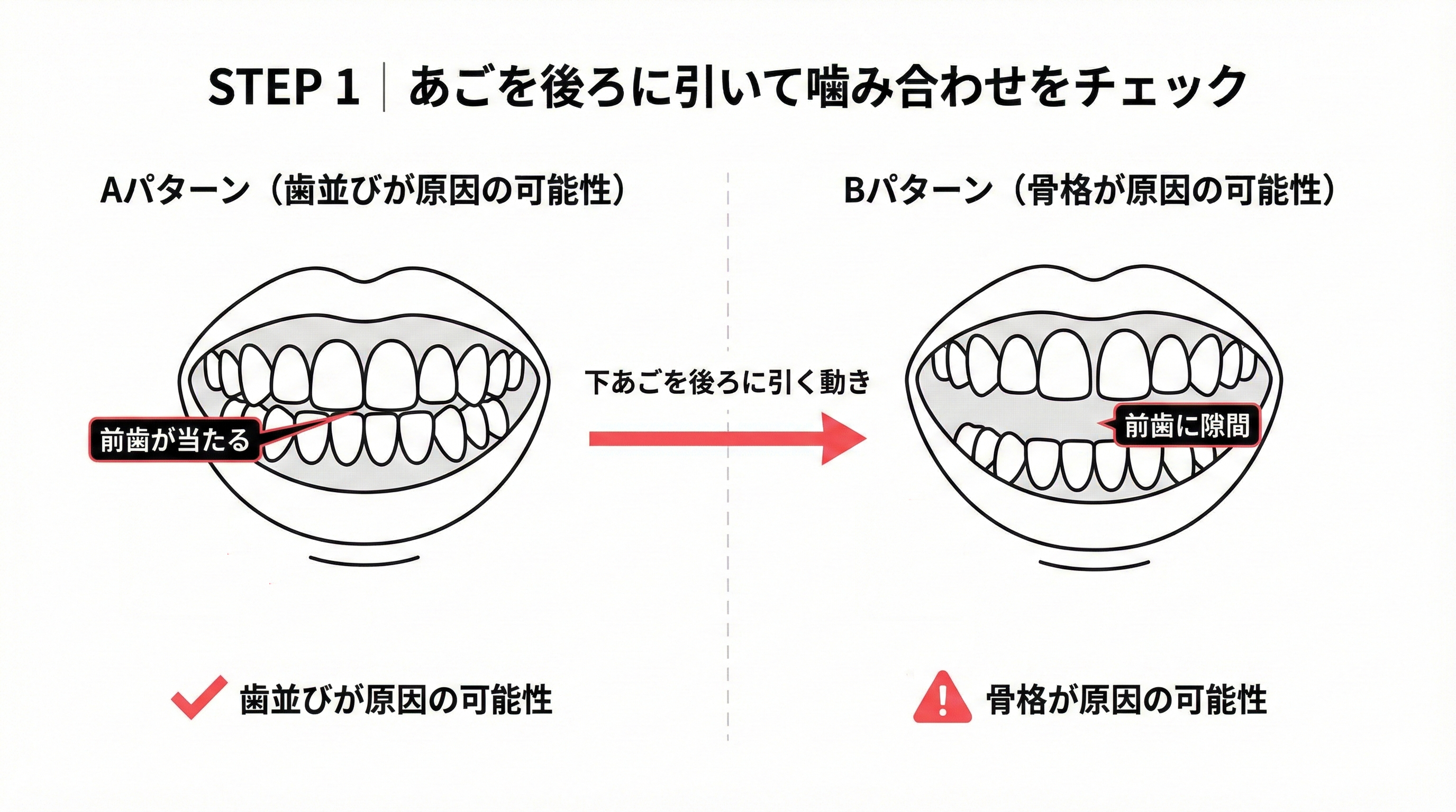 STEP 1:あごを後ろに引いて「噛み合わせ」をチェック