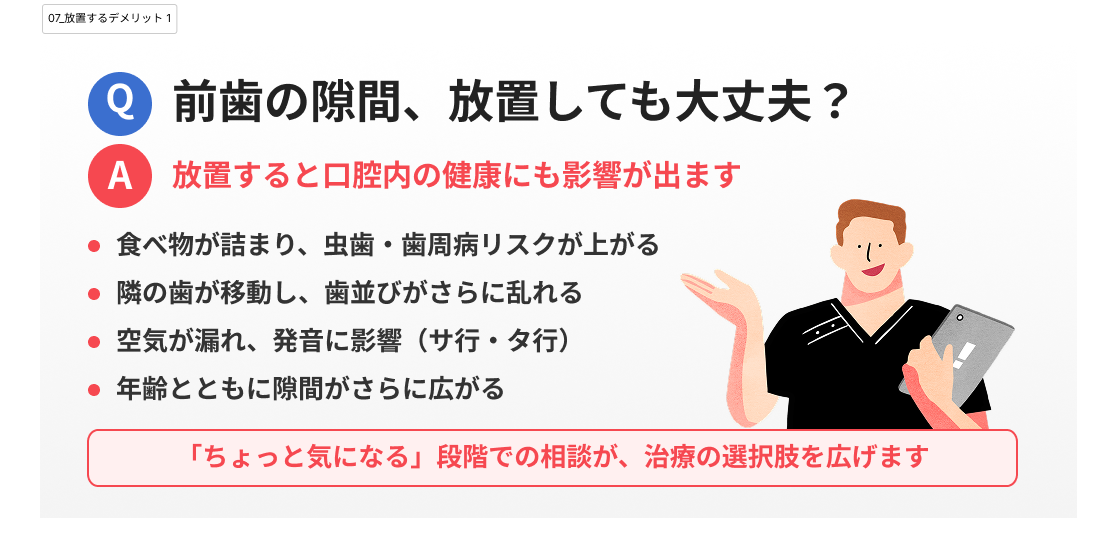しかし、歯の隙間を放置すると、見た目だけでなく口腔内の健康にも影響が出る可能性があります。