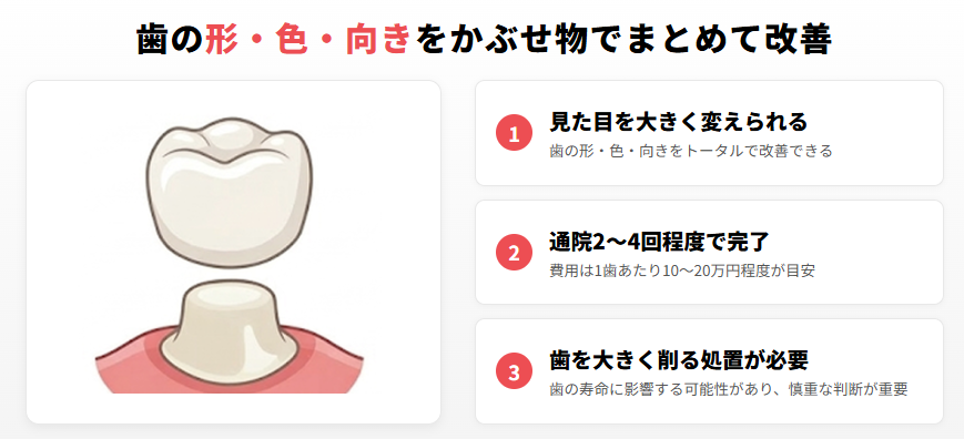 セラミッククラウン | 10〜20万円程度/1歯 | 通院2〜4回 | 歯全体にかぶせ物を装着 | 歯の形・向きが大きく崩れている人 |