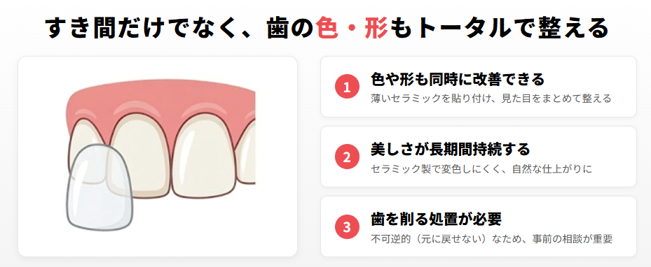 歯の色・形をトータルで改善したい方に適した選択肢です。ただし、隙間の原因(歯並びや噛み合わせ)を解消するものではない点は理解しておきましょう。