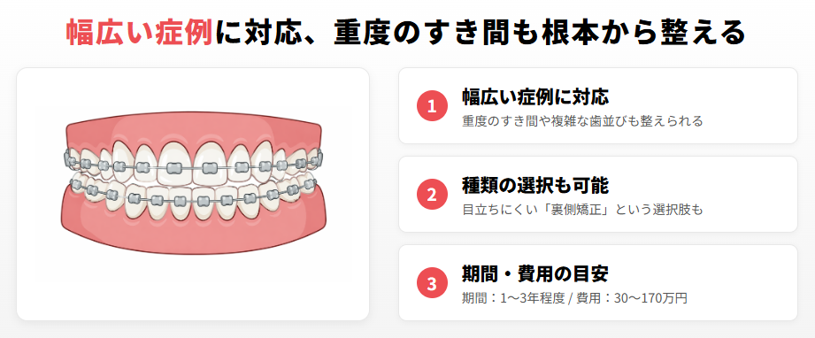 ワイヤー矯正 | 30〜170万円程度 | 1〜3年程度 | 幅広い症例に対応。重度のすき間にも | 隙間が大きい・噛み合わせも治したい人 |