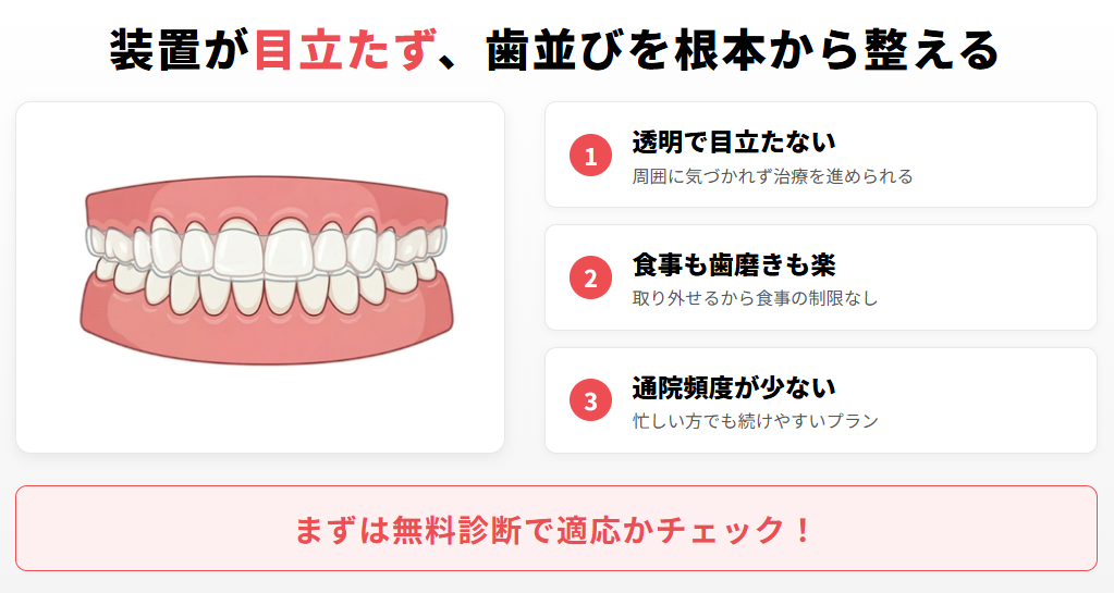装置が目立ちやすい点や、装着中の食事・歯磨きに注意が必要な点はデメリットといえます。ただし、裏側矯正を選べば目立ちにくさは軽減できます。