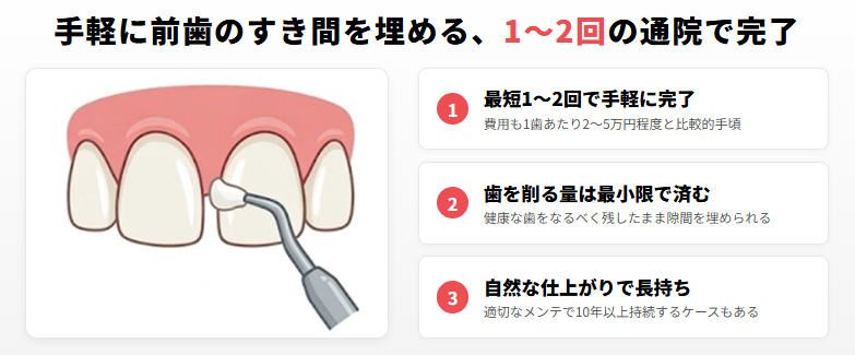 ダイレクトボンディング | 2〜5万円程度/1歯 | 通院2回程度 | 歯科用レジンを直接盛って隙間を埋める | 小さな隙間を手軽に埋めたい人 |