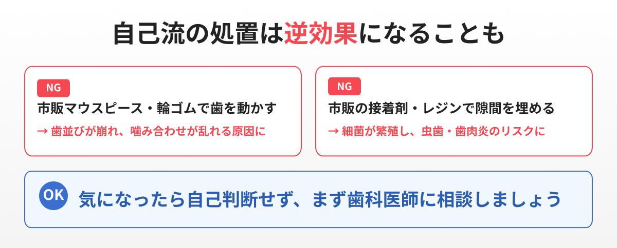 SNSや動画で「歯の隙間を自分で埋める方法」が紹介されていることがありますが、自己流の処置にはさまざまなリスクをともないます。