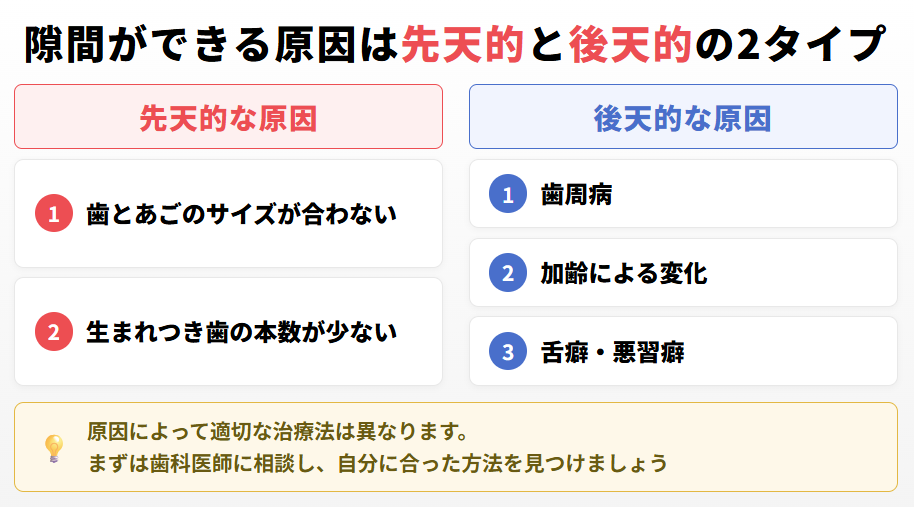 歯と歯の間に隙間ができる原因は、大きく「先天的な要因」と「後天的な要因」に分けられます。