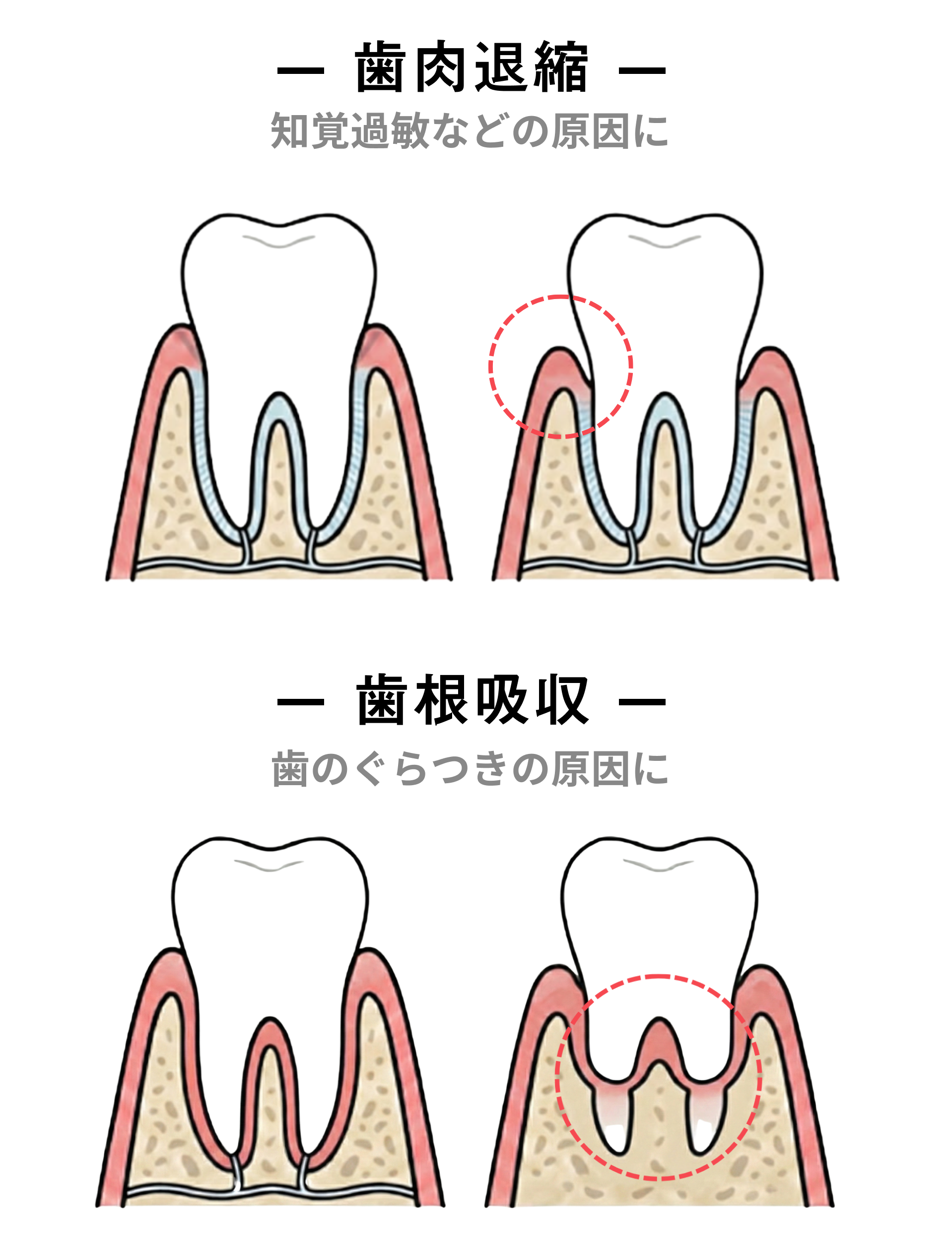 歯が長く見えて老けた印象になったり、歯の根っこが露出して冷たいものや風がしみる「知覚過敏」の原因になったりします。