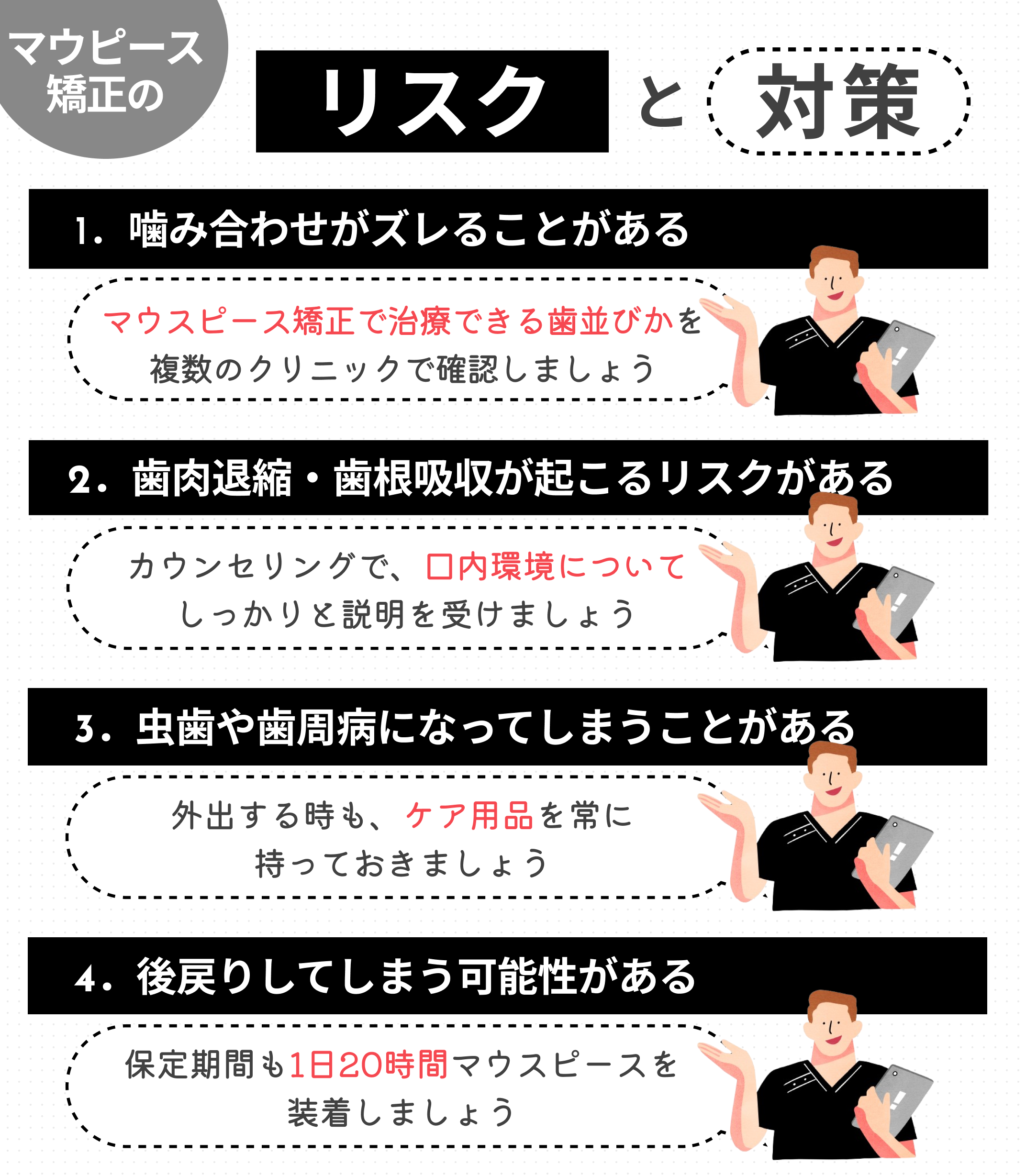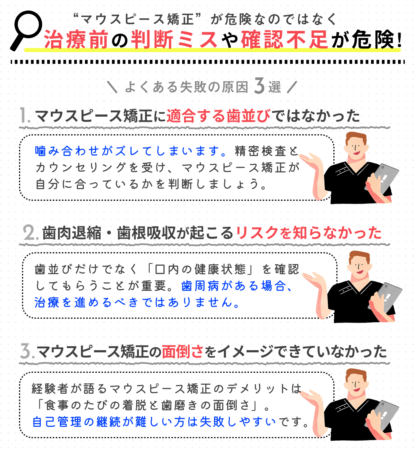 マウスピース矯正が「危険」と言われる背景には、いくつかの理由があります。ただし、その多くは事前の確認や適切な対策によって防げるものです。