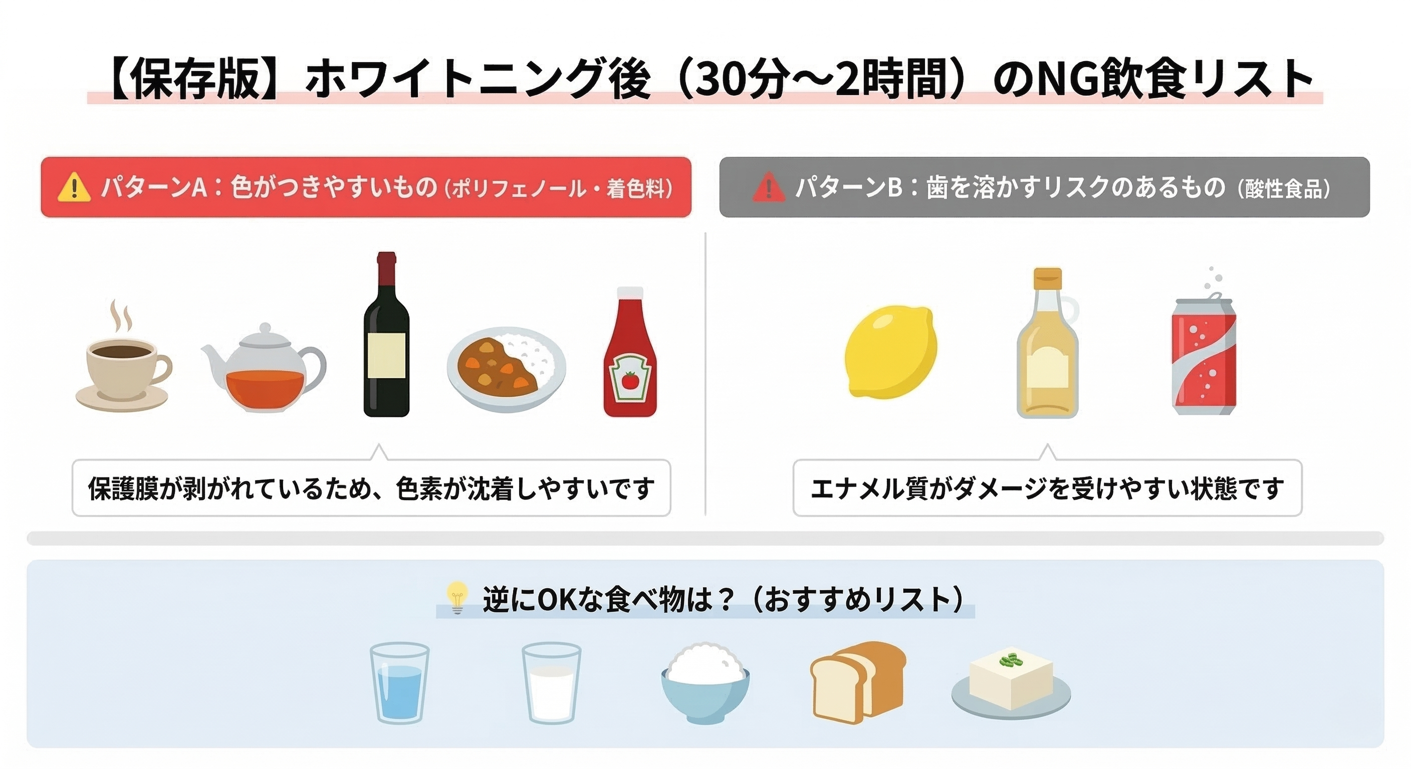 ホワイトニング後30分〜2時間は、歯の表面を守る膜(ペリクルという保護膜)が一時的に剥がれた状態になります。