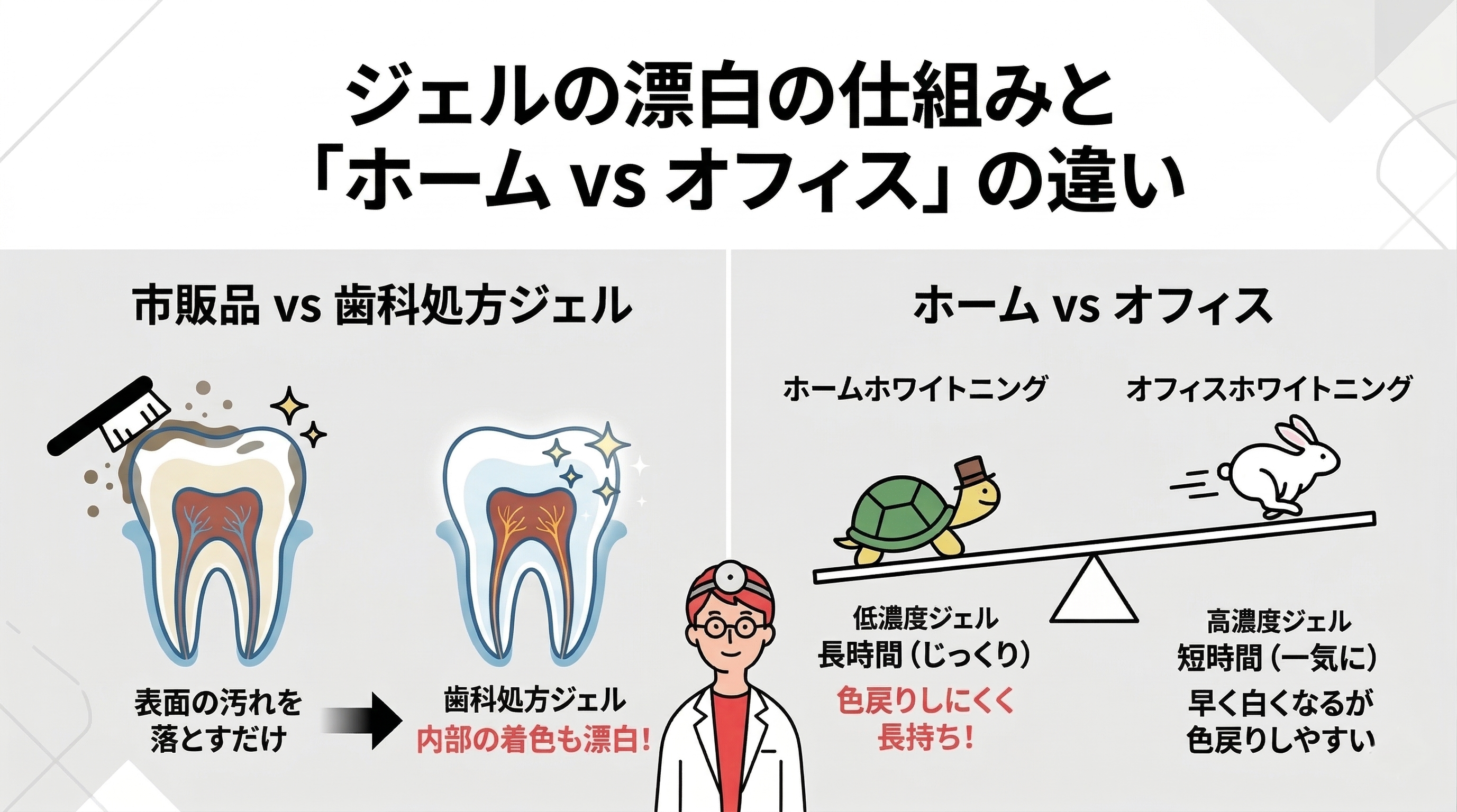 歯科医院で行う「オフィスホワイトニング」では、高濃度のジェルを短時間で作用させます。一方、ホームホワイトニングでは低濃度のジェルを長い時間かけてじっくり浸透させるのが特徴です。